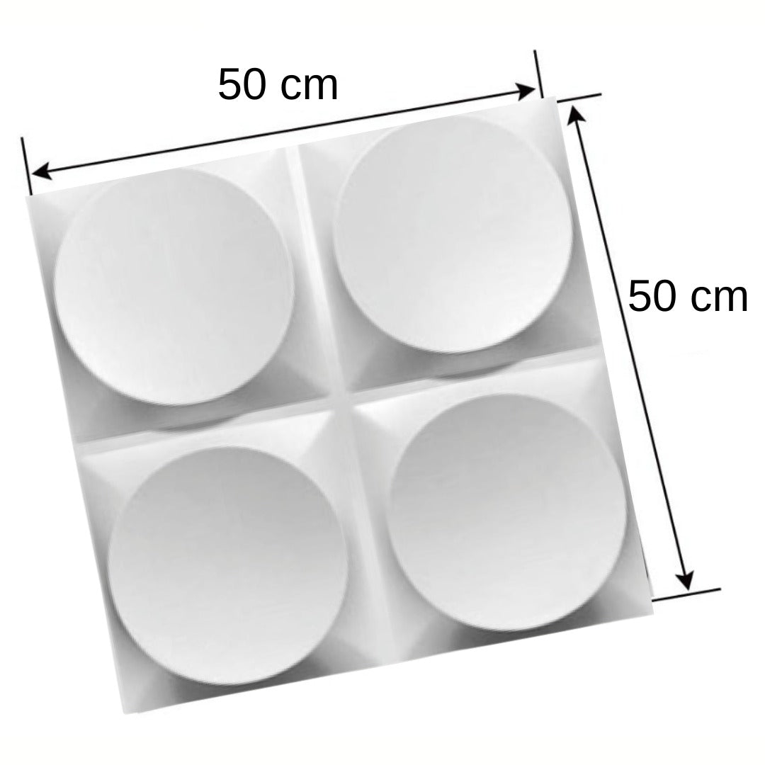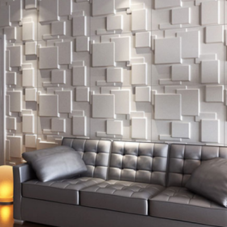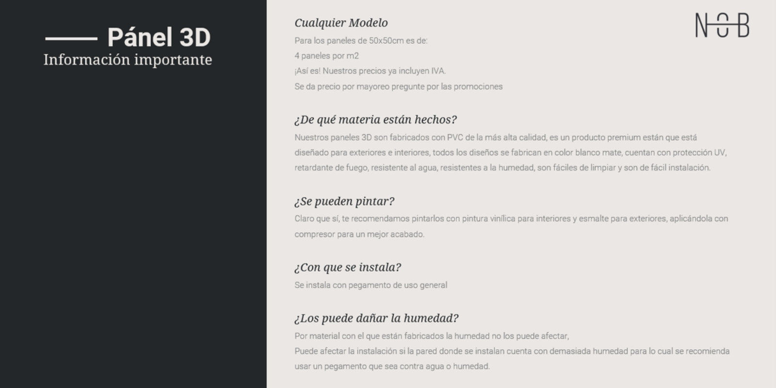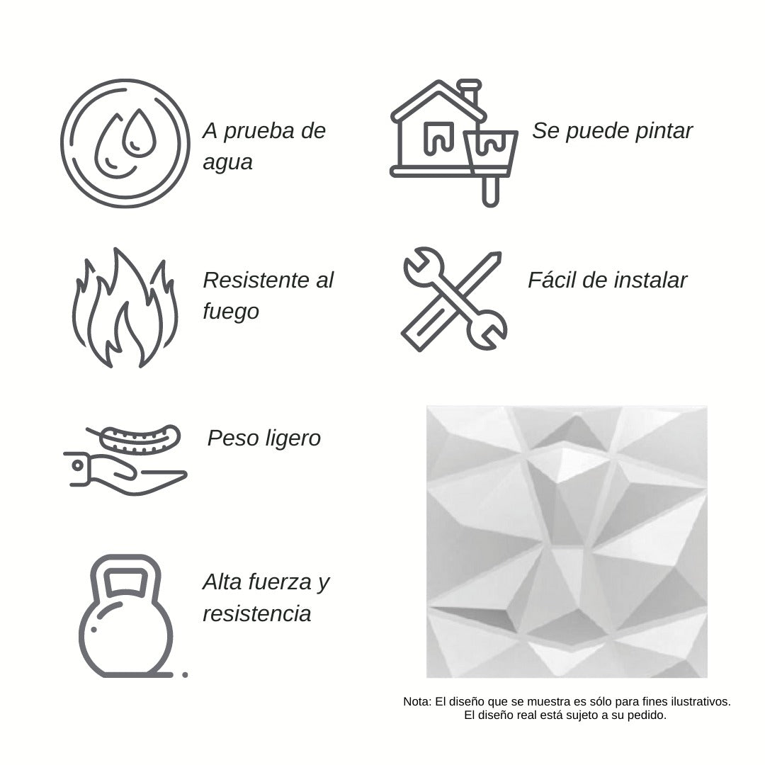 Panel tridimensional fabricado en PVC virgen en color blanco. 12 paneles de 50x50 cm por caja. Una caja cubre 3 metros cuadrados